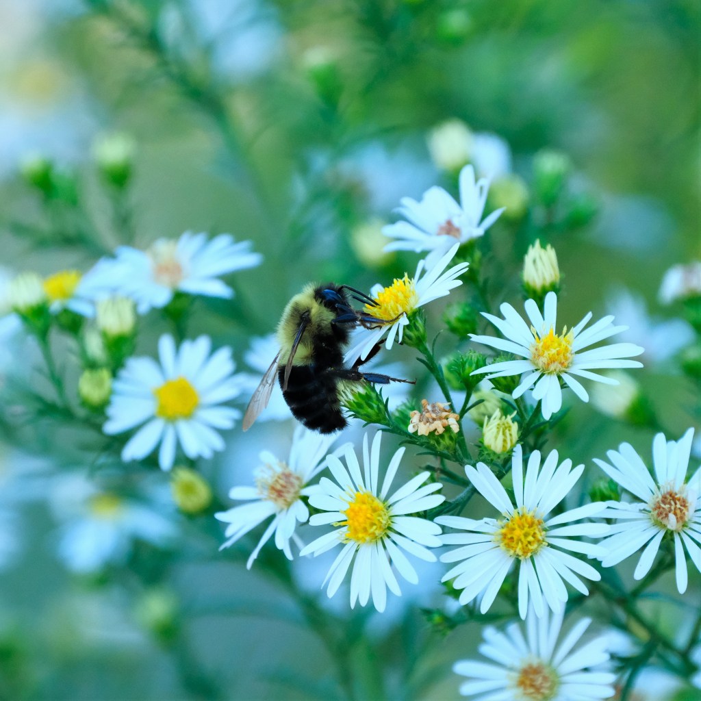 Lastly, the asters continue their pageant of colors, and here’s a bumble bee on a pretty, little, white one.