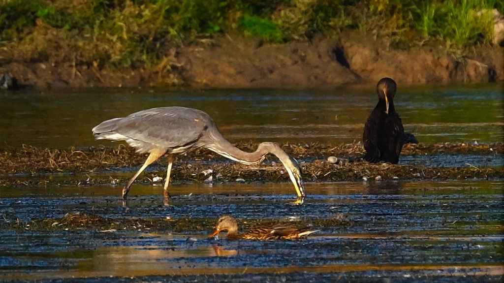 Unfortunately, the cormorant wasn’t ready, so here’s a better one of the cormorant with the heron and a bonus mallard hen, but without the kingfisher. It was a regular wild kingdom out there yesterday morning.