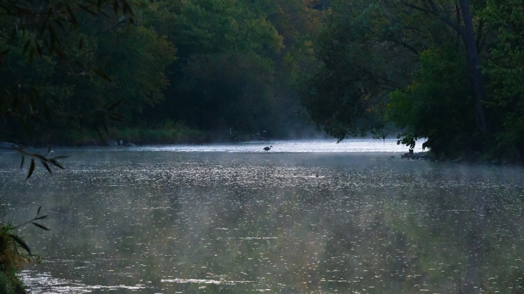 Well, the first sight to greet me was a great blue heron fishing in the mist where the rapids resume after the big, wide, slow part of the river below the falls. What an absolute treat.