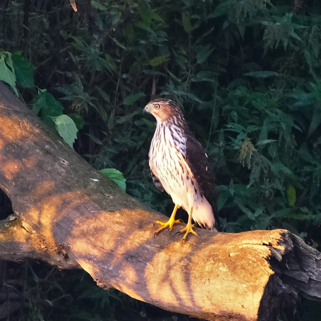 The first sight to greet me at the river was this handsome red-tailed hawk Cooper’s hawk on a big log jutting out just over the water, and maybe it had been getting something to drink as I walked up.