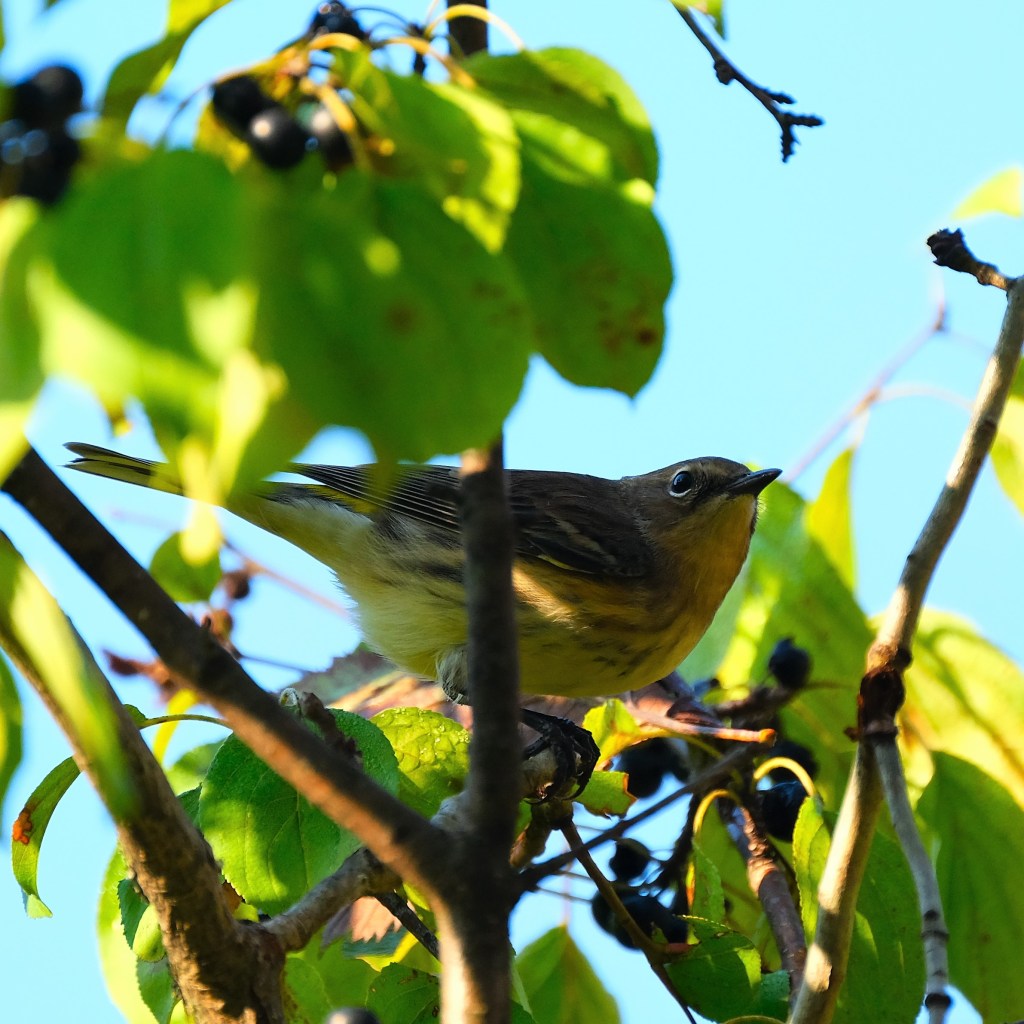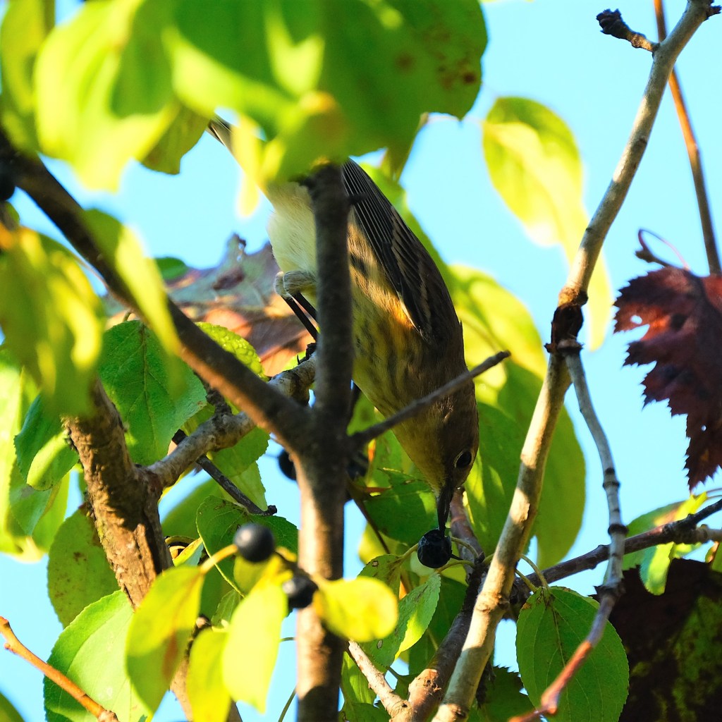 I had begun to think that we had seen our last warbler, not counting the waterthrush, of course, but look who I saw sampling the buckthorn berries just south of the falls. You can just make out the tell-tail yellow patch on its lower back that makes it a yellow-rumped warbler.