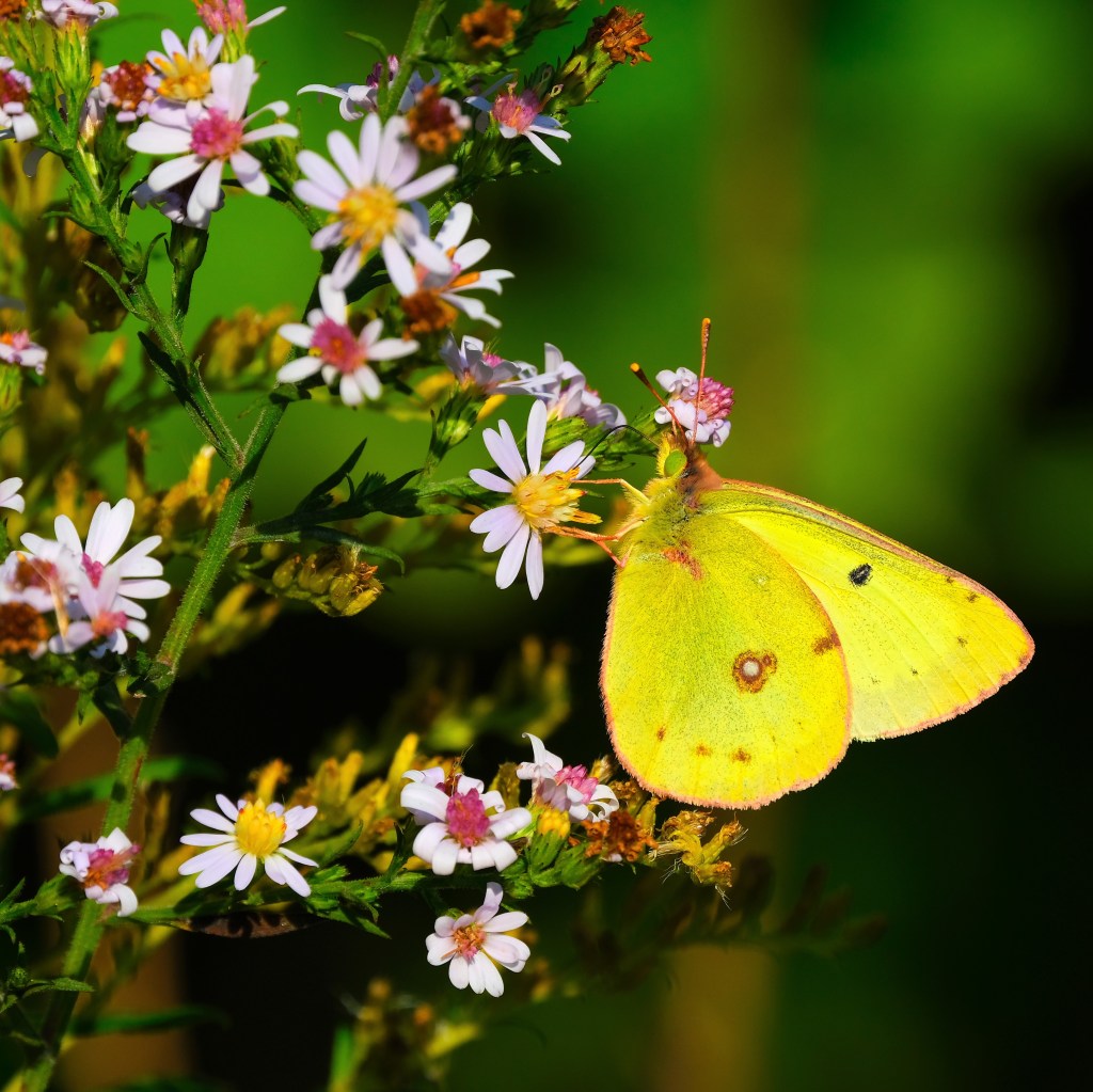 Lastly, when nature only gives us cabbage whites and sulphurs, I guess I’d better take pictures of cabbage whites and sulphurs, eh? Well, in that case, here’s a sulphur from this morning sipping nectar from the pretty little light-purple asters beside the Oak Leaf Trail.