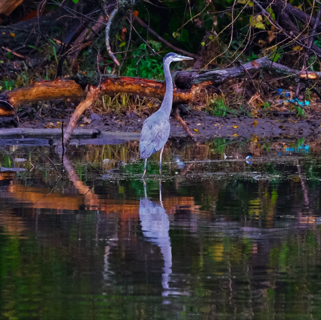 This morning was turning out way better than I expected, but it started to sprinkle pretty good, so I headed back south and spotted our obligatory blue heron on the far shore right in front of a log that looks as though beaver have been working on it.