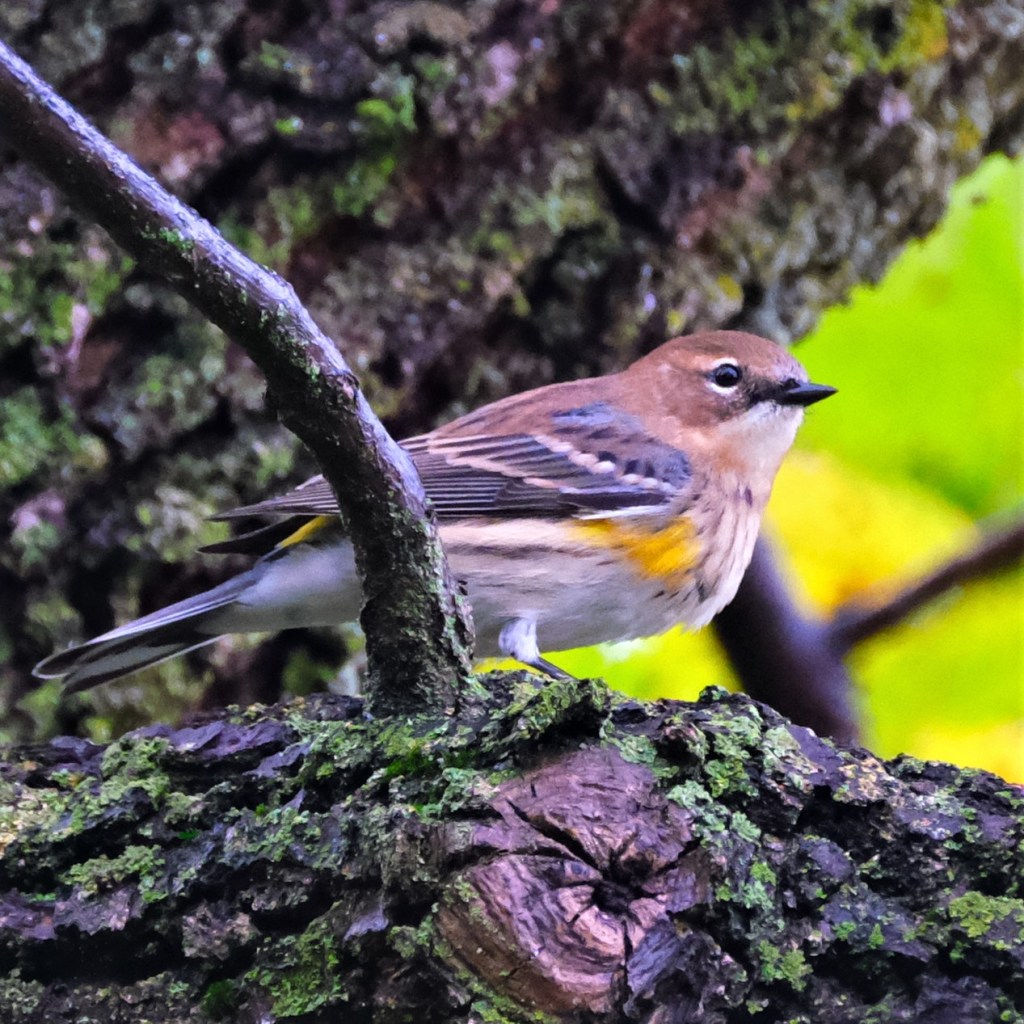 A yellow-rumped warbler was busy foraging in the tree above it.