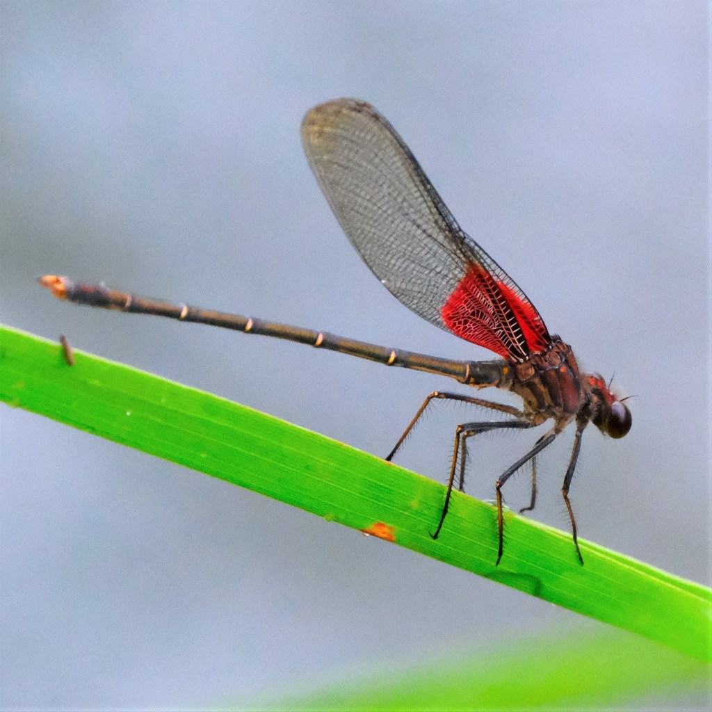 Finally, right behind the waterthrush, there were still damselfies clinging to the long blades of grass bending over the river, and as best as I can tell, this one is a male American rubyspot (Hetaerina americana)