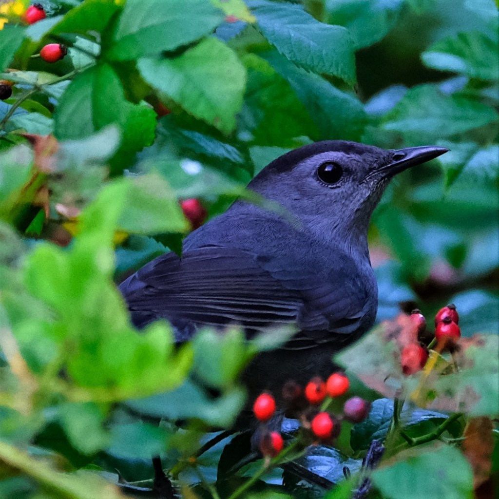 This grey catbird was after the berries you can see in the foreground, and every time it turned to grab one, my autofocus couldn’t follow, so all I got was a blur, but at least this one still image came out.