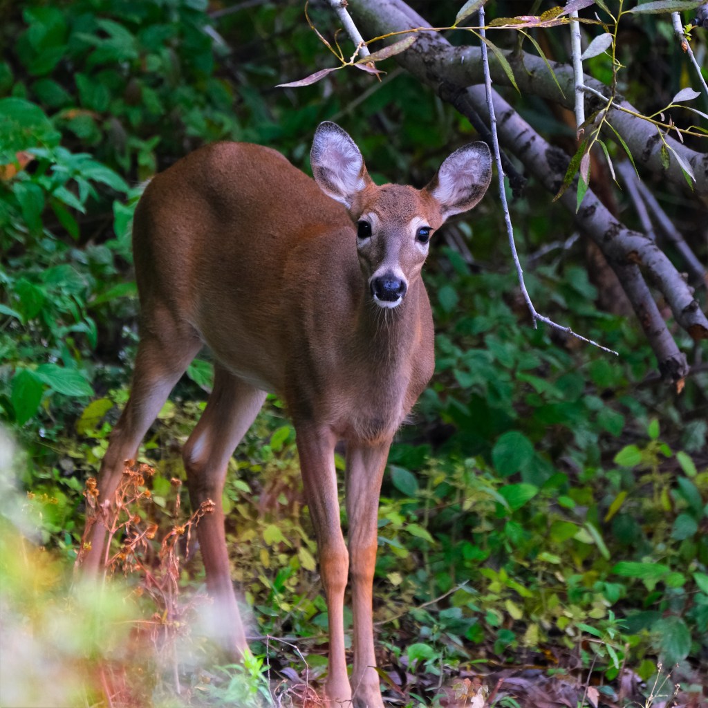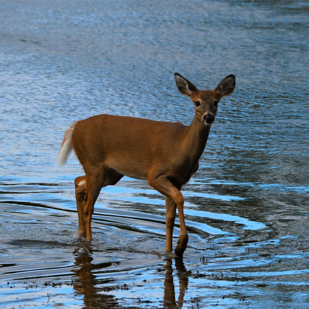 First up, a bit after the four deer strode up onto the island and disappeared in the brush, this young one came back out seemingly to see what that weird old guy on the far shore was up to.