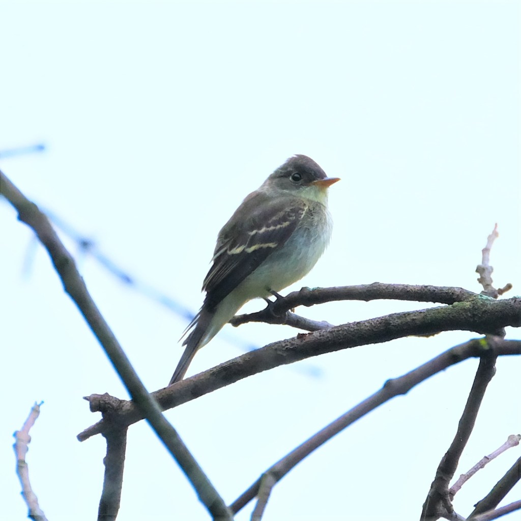 On shore, a flycatcher, looks like an eastern wood-pewee, was perhaps waiting for enough visibility to spot flies.