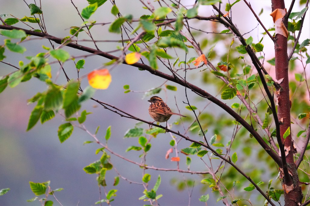 A bit lower, a white-throated sparrow was taking a break from foraging in the tall flower stalks.