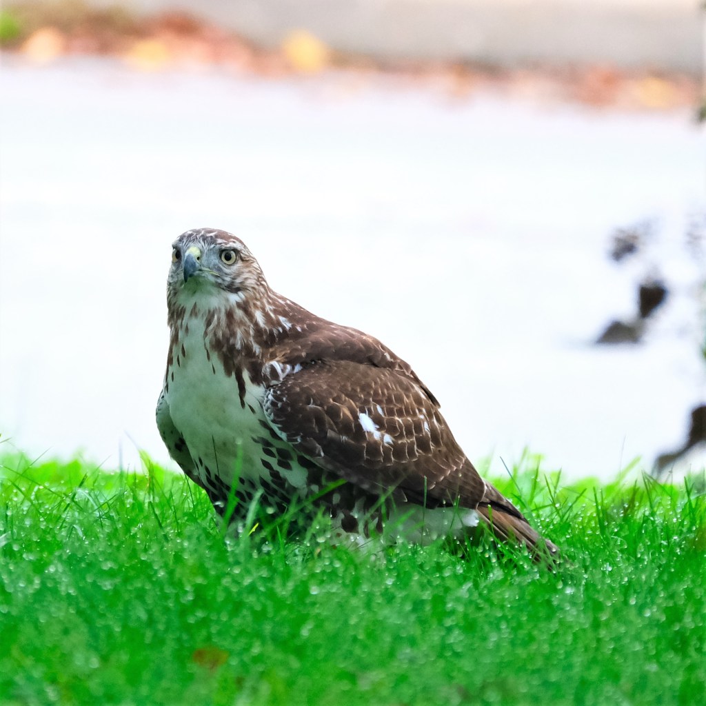Anyway, as we were chatting, this magnificent red-tailed hawk made a try for a squirrel but missed and ended up on the lawn, not 30 feet away, right by the parkway. For a moment, it appeared to be torn between trying for the squirrel again, who was just right up there…