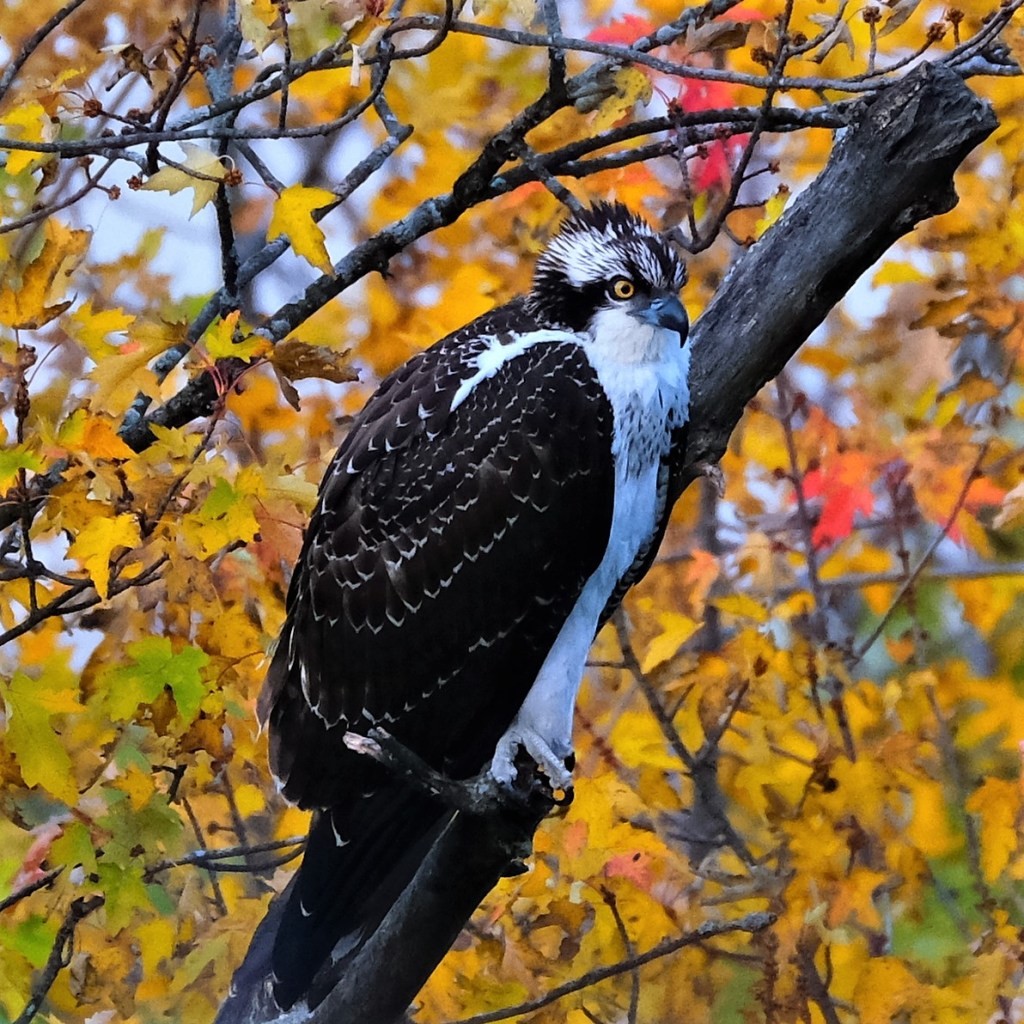 Our resident osprey was in one of its favorite spots again, on a tree overlooking the river where the path is separate from the parkway by just a guardrail.