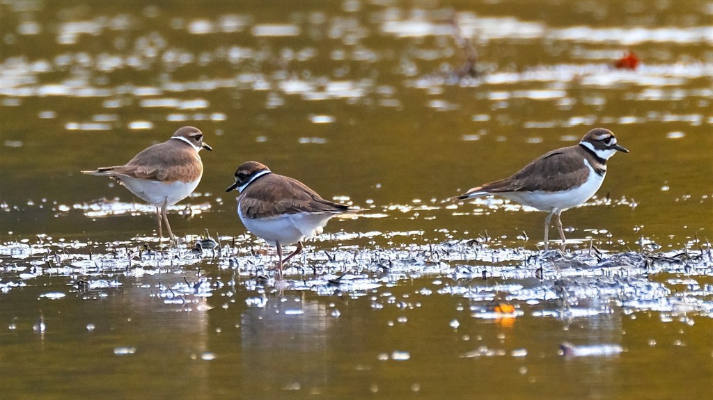 There were a few mallards on the pond, but I may have overexposed them yesterday, so we’ll give them a pass today and let the river do the heavy lifting instead. Besides dozens of more mallards and a pair of geese, I saw up to six kill deer foraging together, and these three were kind enough to arrange themselves for this portrait.