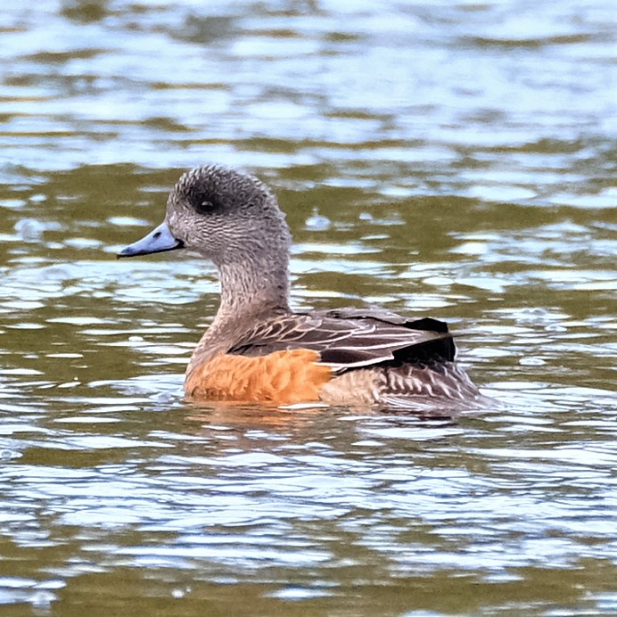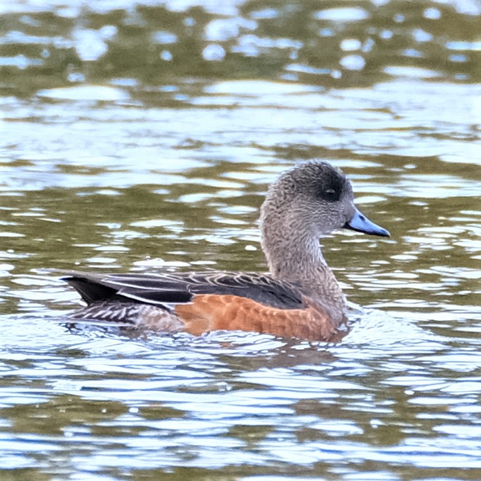 I am also thrilled to report that we seem to have another new guest, and I believe she is an American widgeon hen (Mareca americana). Her plumage looks right, with a “warm brown body and a dark smudge around the eye“, and we’re in her migratory range. My only hesitation is that her bill doesn’t look light enough above the dark tip, but perhaps that’s just due to the lighting on the river this morning. This picture, from Bird Watch Daily, matches our visitor better.