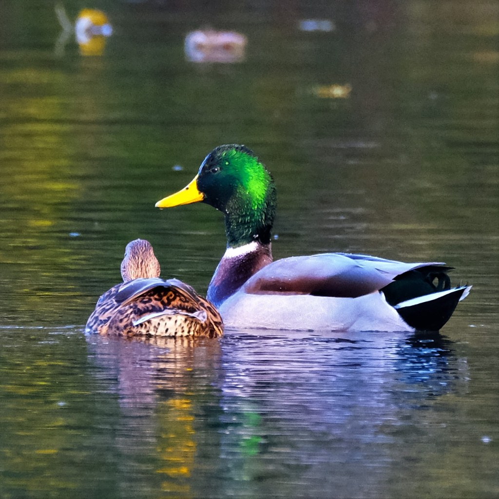 Mallards are ubiquitous and the drakes are all in full plumage now. Here’s a drake keeping an eye on me while his hen, or the hen that allows him to swim around with her for now, continues foraging. Gotta love that iridescent green, eh?