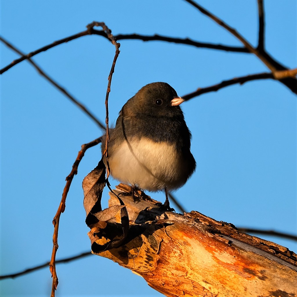 The dark-eyed juncos have also made themselves at home, and I keep coming across large groups of them foraging together. Here’s one taking a break to look at the camera.