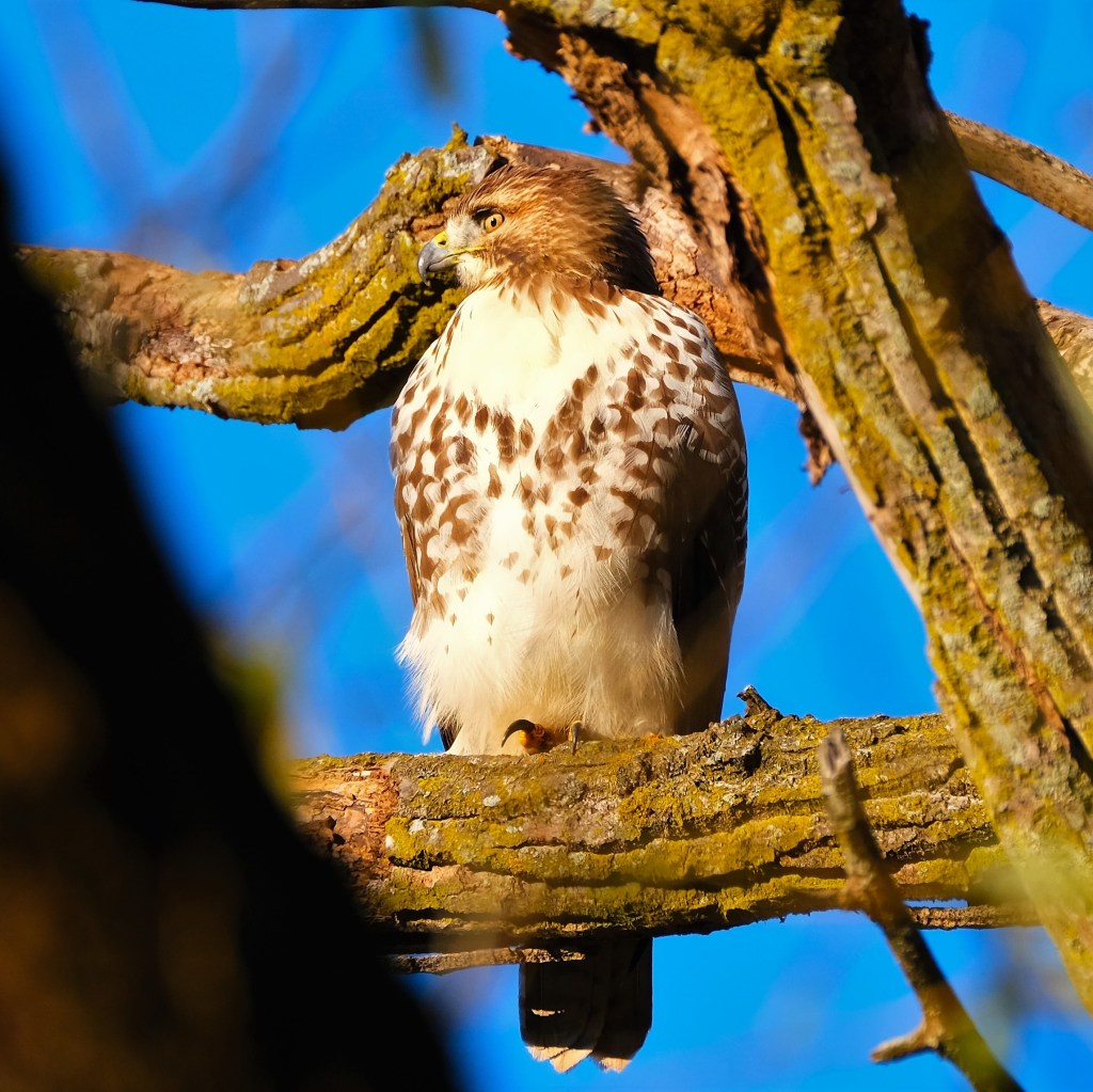 At the north end, in the tall trees between the meadow and the river, I spotted two big, light-colored shapes. One turned out to be the sun-bleached wood of a barkless stump of a branch, and the other turned out to be the white belly feathers of this red-tailed hawk, perhaps also warming itself in the sun. Notice a theme?
