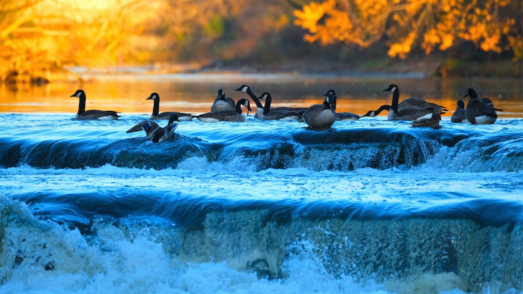 There seemed to be a new flock of geese or two on the river, and here’s a gaggle, along with a mallard or two, just above the falls.