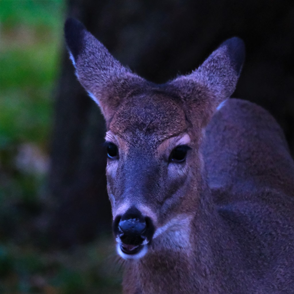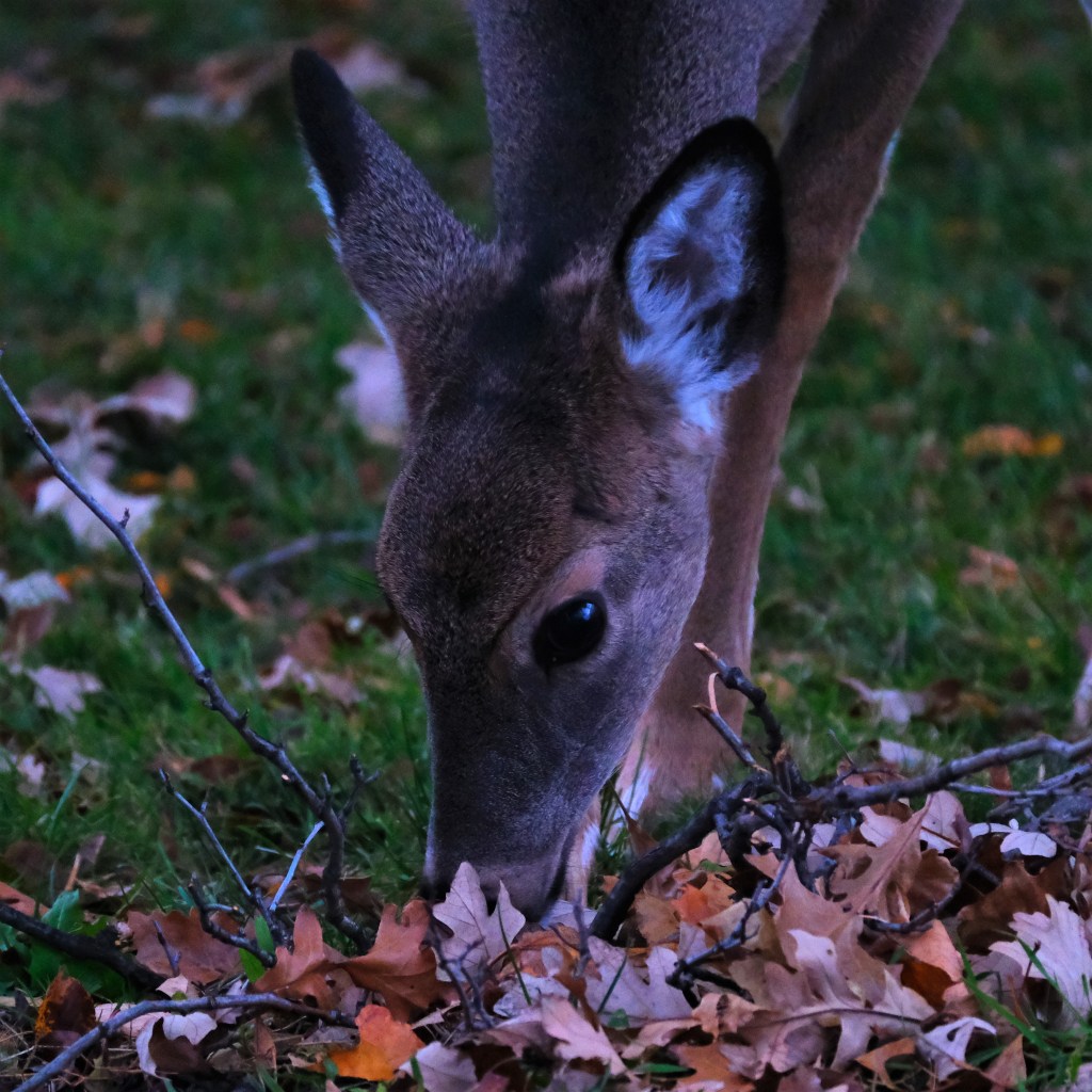 A trio of deer, perhaps a doe and two of her youngsters almost all grown up, were grazing under the crabapple trees by the southern parking lot when I arrived, and this one was the least perturbed by me. Perhaps it is the same one as on Monday, and now knows the drill.