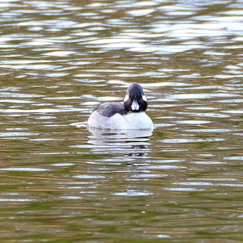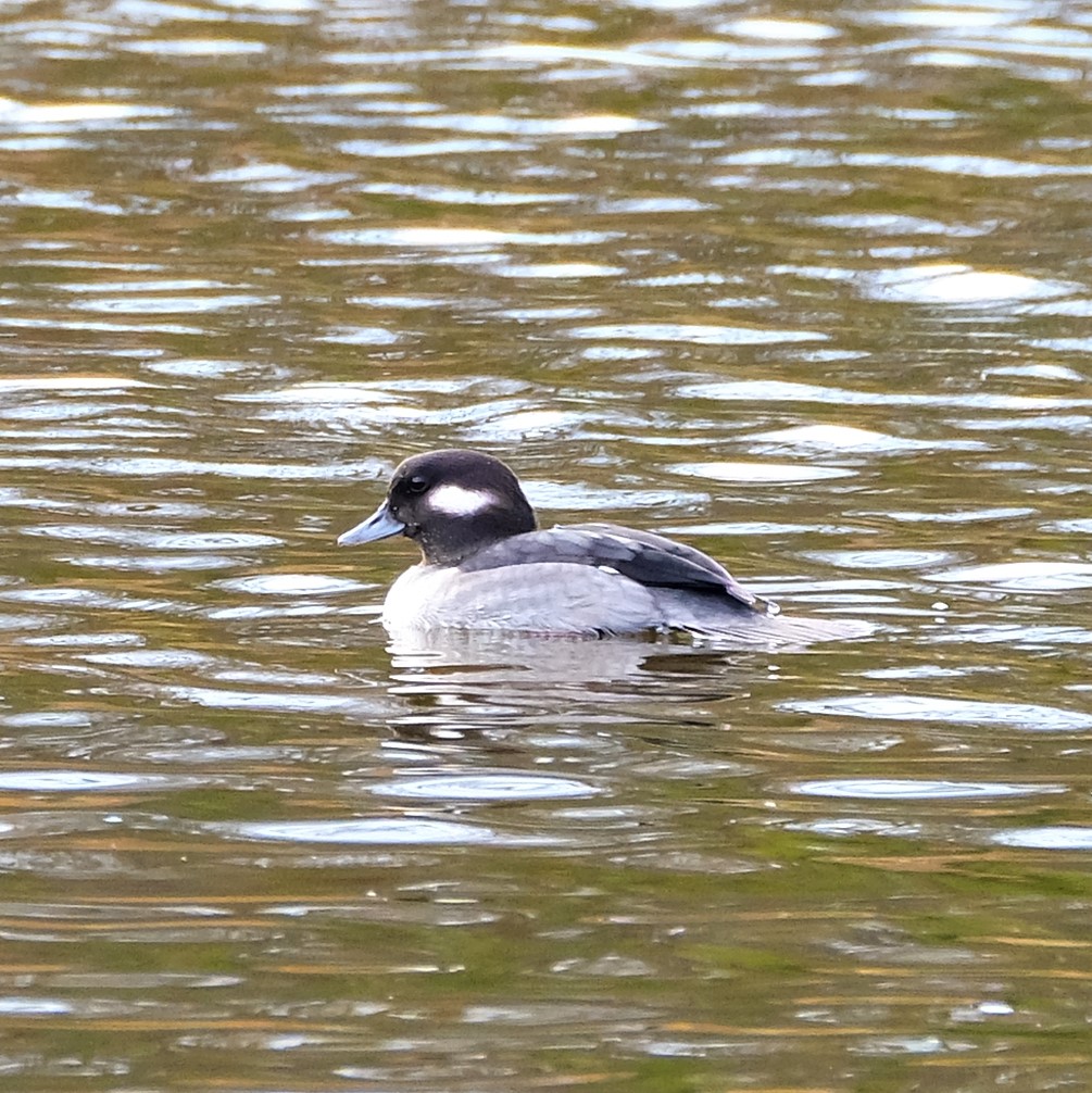 The main event, however, came at the north end, as I approached the boat ramp, when a birder walking south mentioned that they had just seen a bufflehead. Be still my heart! I hustled up to a gap in the brush, and sure enough, there it was. There was just one, so far, and here she is, showing off her namesake head.