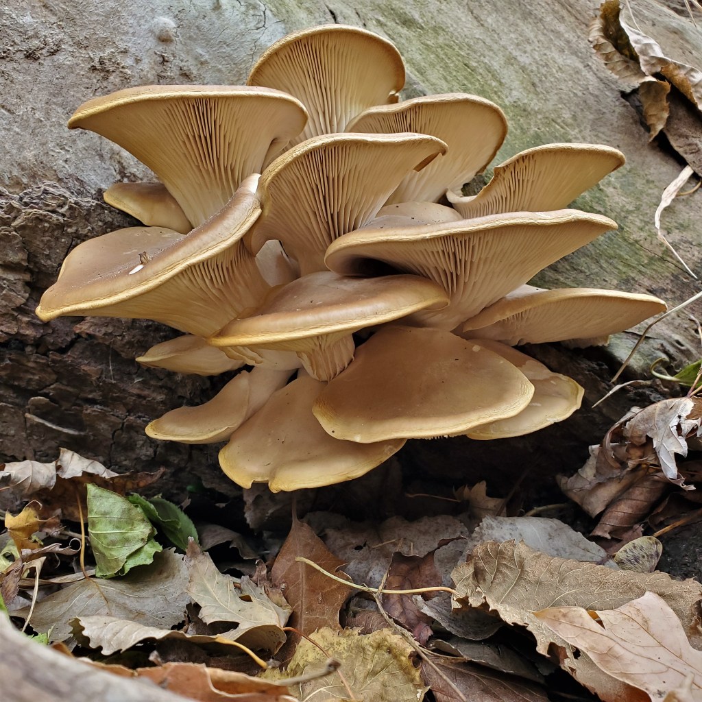 As far as I can tell, these are grey oyster mushrooms (Pleurotus ostreatus) and quite edible, but I’m saving my appetite for tomorrow.