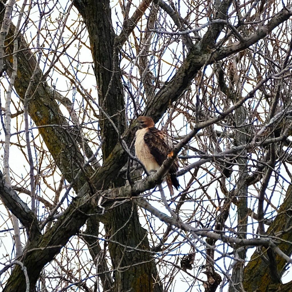 There was no sign of the bufflehead or the mergansers this morning, and a blue heron was on the east shore up ahead, but someone else flushed it out, probably inadvertently, before I could get close enough. Instead, I did manage to get this image of a red-tailed hawk high above the far shore. Perhaps it’s the same one we saw just Monday.