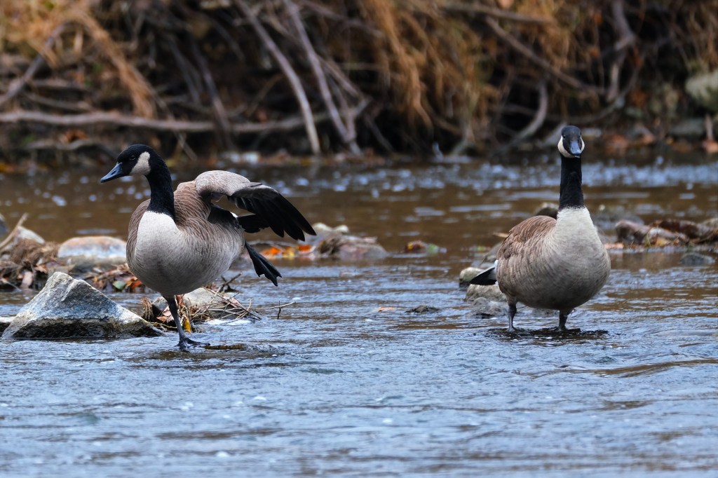 Finally, there was a trio of geese on the lower river, amongst the mallards, and here are two of them taking turns stretching. Perhaps stretches are contagious among birds similar to the way that yawns are contagious among people.