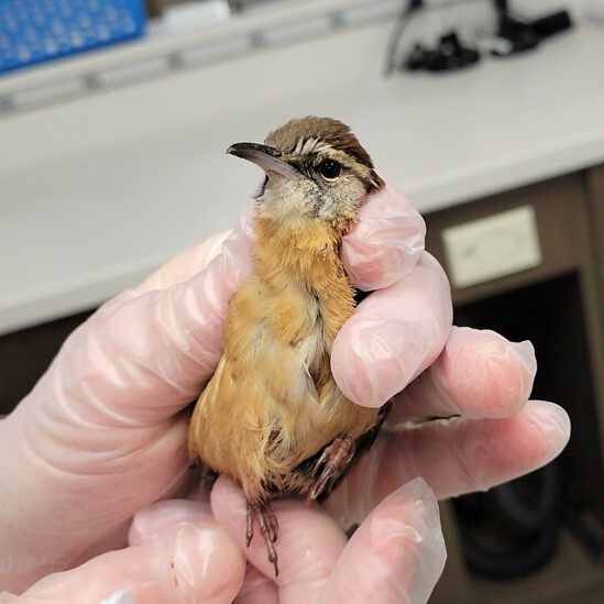 Our best guess is that this unlucky/very lucky little cutie is a Carolina wren (Thryothorus ludovicianus). Deb confirms that “the edges of his wings were checkered,” and reports that when released “he just flew off.” We’re all hoping it recovers fully from this traumatic experience.