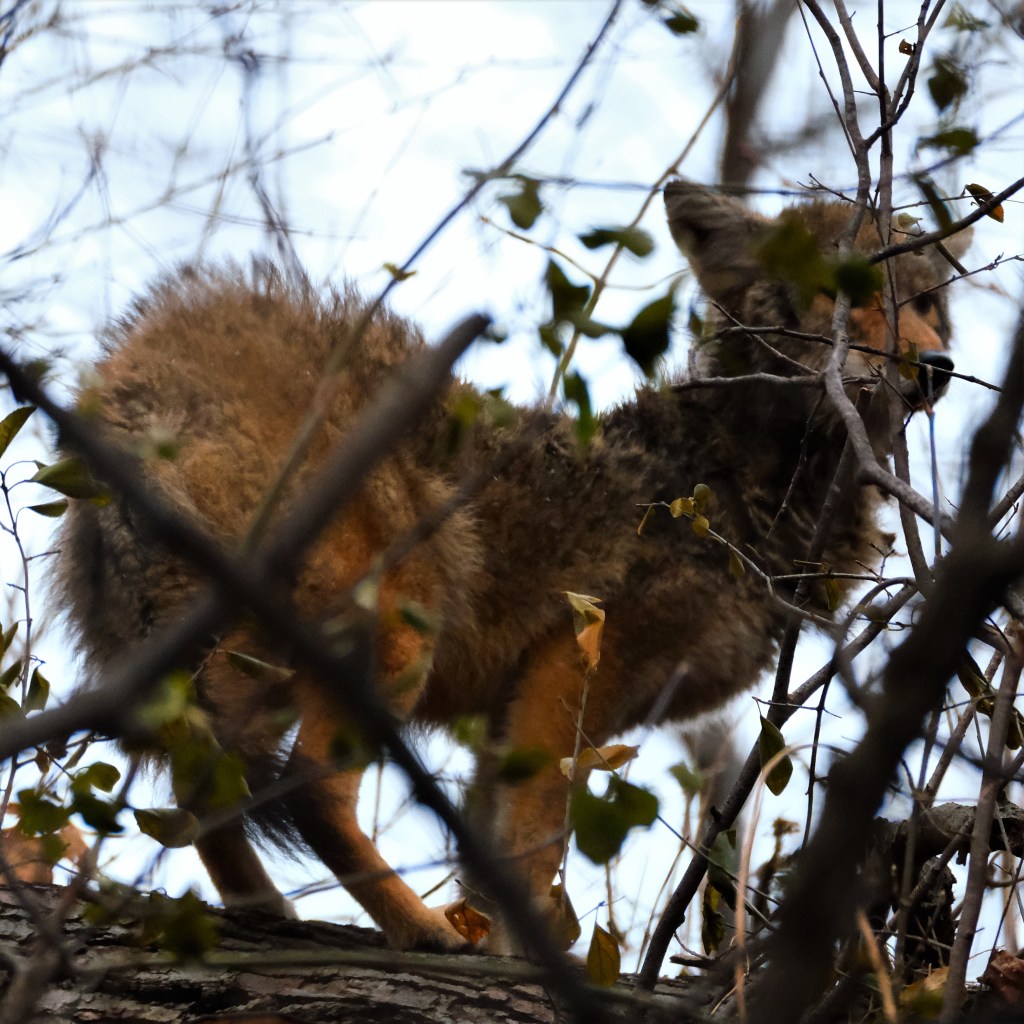 Wonders never cease, however, and look who finally decided to make an appearance! I first spotted it right on the trail along the river, but Icouldn’t get my camera on it before it scampered up the bank. Luckily, as I continued north, it gave me another chance and looked down upon me from the top of the bluff. As you can see, I couldn’t get my autofocus to pick a path through the twigs between us, but I believe you can still clearly recognize a coyote (Canis latrans) when you see one. Somewhere, Mike De Sisti is laughing out loud, I’m sure.