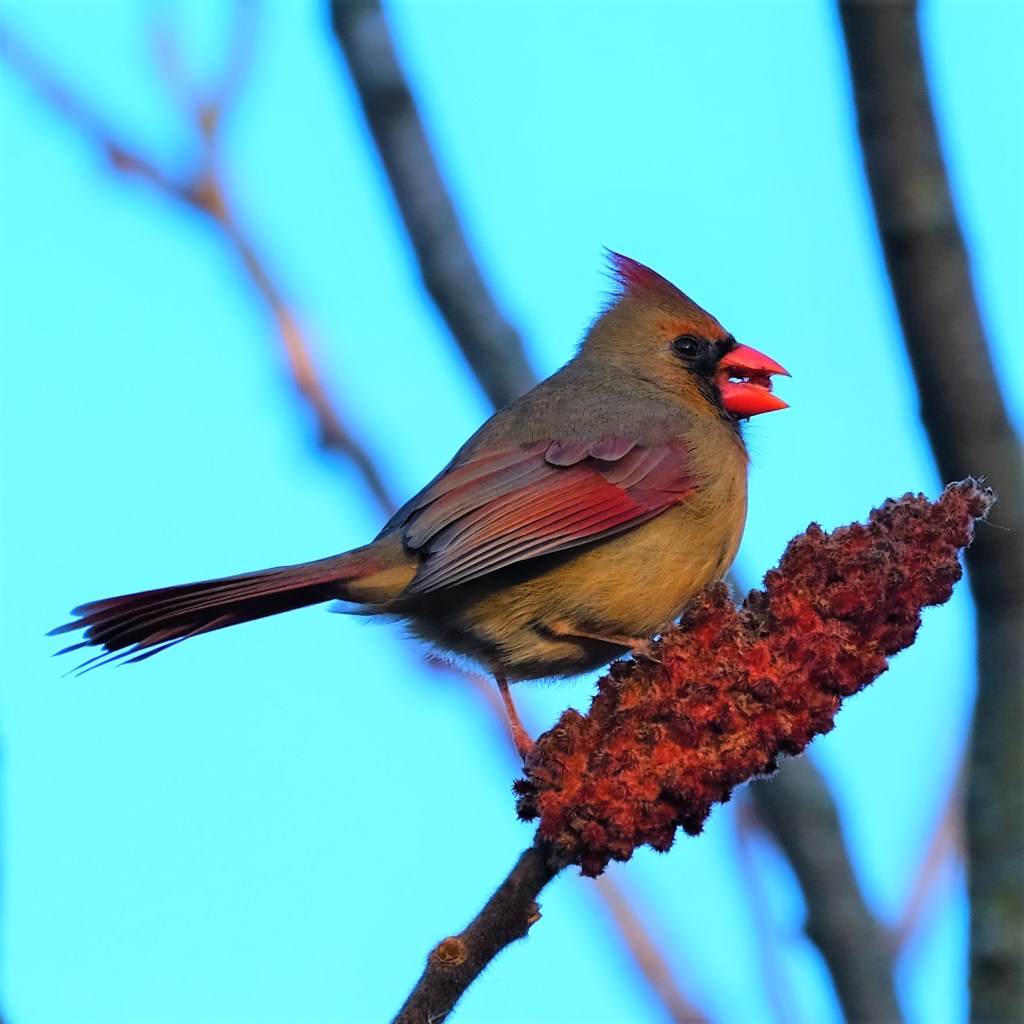 Here’s another look at that female cardinal on the sumac below the beer garden after she hopped right up onto her breakfast buffet.