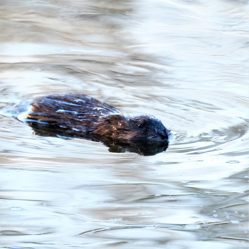 When I first spotted the bufflehead, I had no idea, of course, that I’d have better opportunities, so I did try to take a few pictures. When I was done crouching down and got up to continue north, look who was swimming up river behind me. Sure enough, a little muskrat who was as surprised by our meeting as I was.