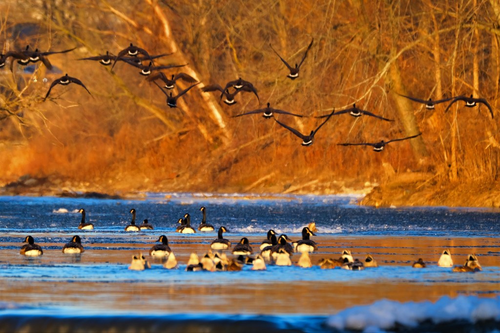 By the time I approached the falls, the sun was finally shining down into the river valley, and the open water above the falls was chock full o’ geese and mallards.