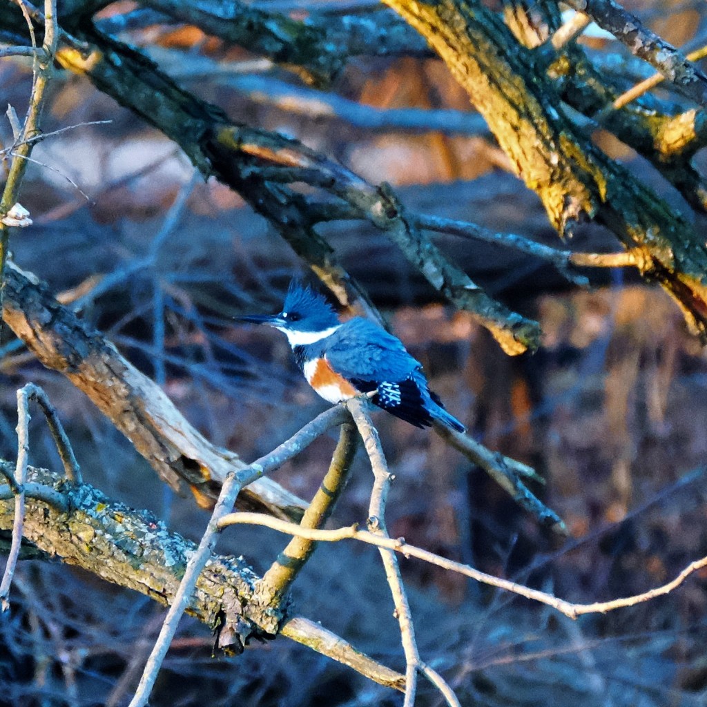 Along the river, I heard the kingfisher again, but I couldn’t get a good picture, so here’s a better one from yesterday. She had just come out of the water after a dive that appeared to bear no fruit. Recall that the air was 19°F at the time. She’s one tough little bird, eh?
