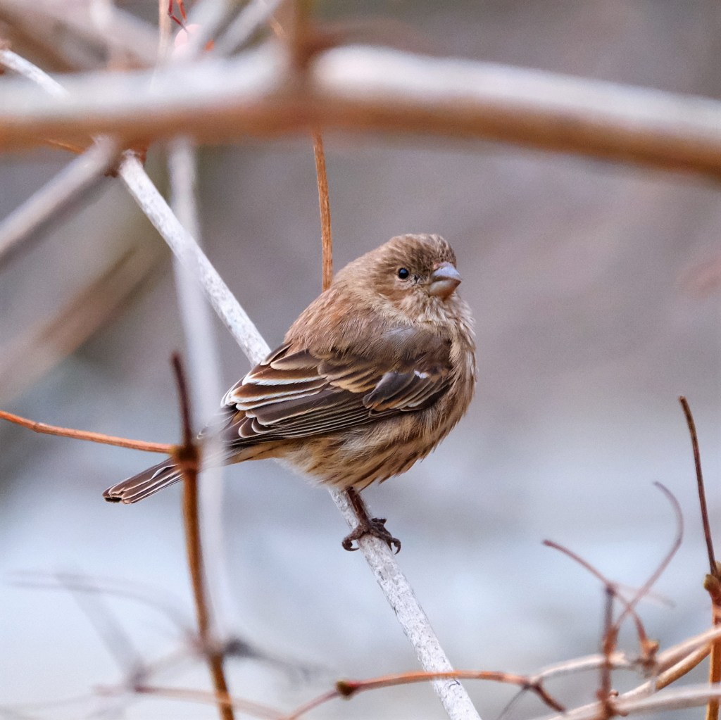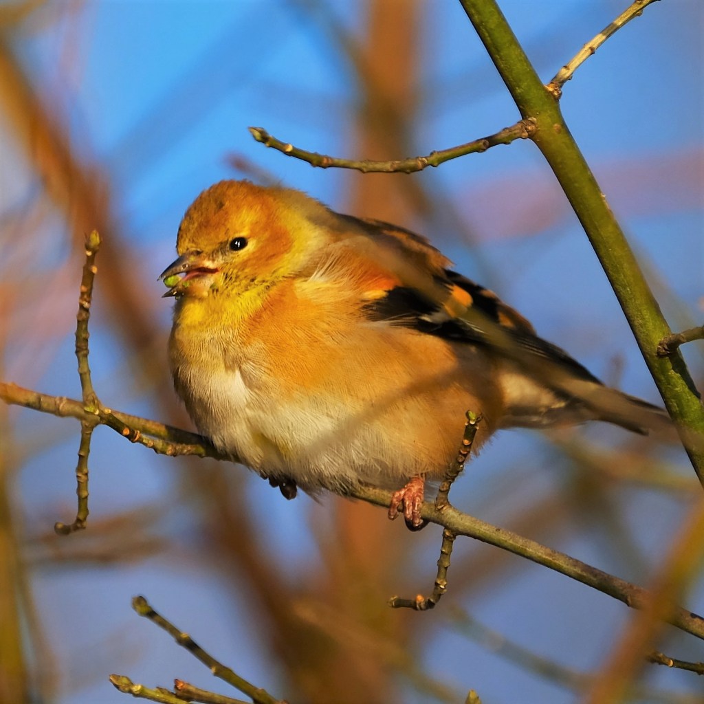 Lastly, on a more-colorful note, here’s a goldfinch from yesterday who appears to be eating the tiny leaf buds off the little tree it is perched on.