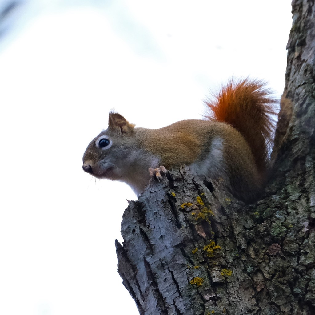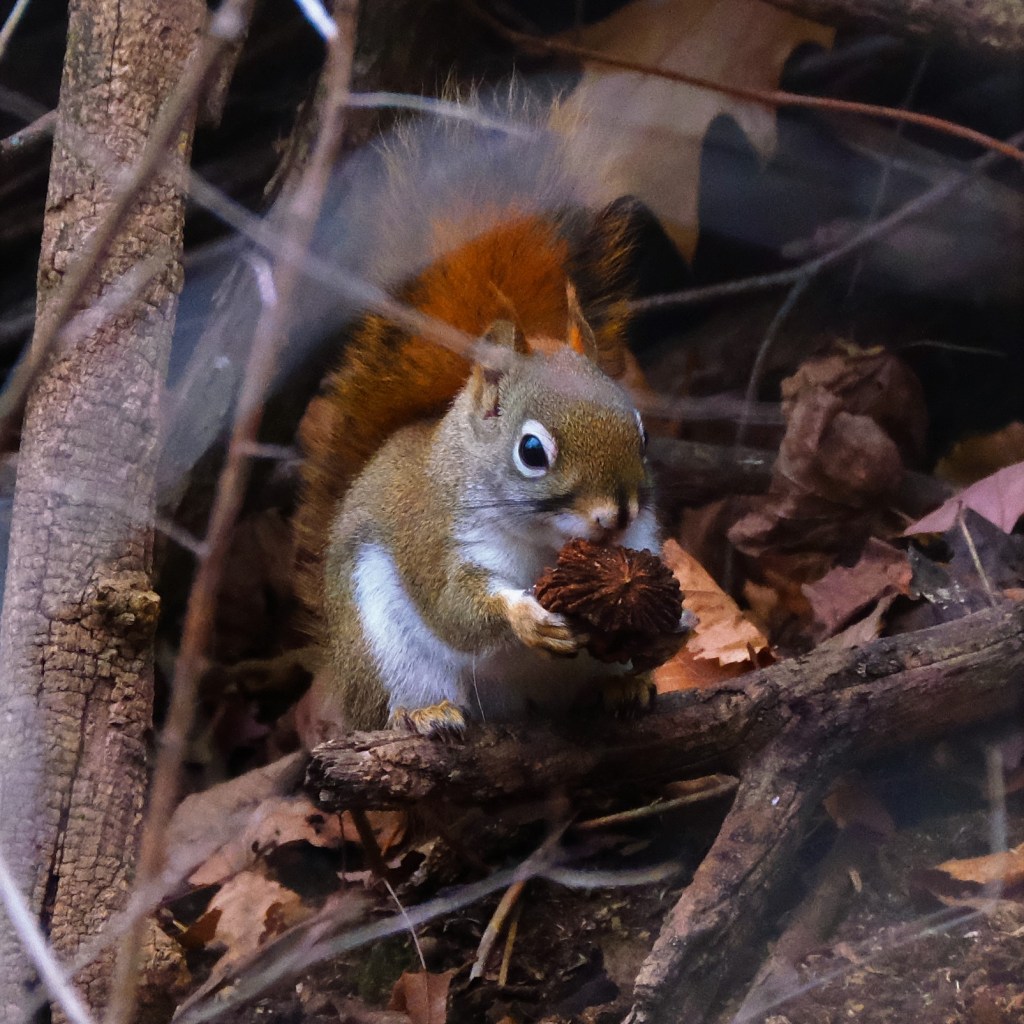 I found this little red squirrel munching on a walnut just like his big grey cousins do, which is something I haven’t seen before. By that time, there was enough light, so this really is a picture from this morning.