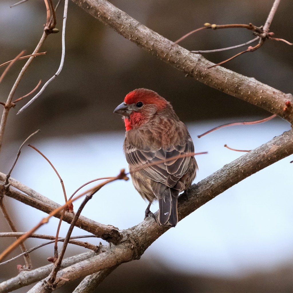 I didn’t see anything else worth a picture until the north end, where there were a bunch of house finches in the bushes at the water’s edge. Here’s a male, …