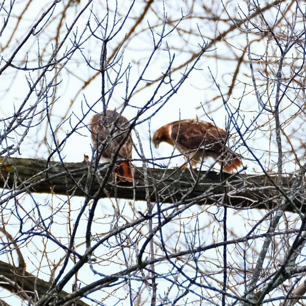 The surprise for me, though, was that while I was trying to focus on all these little birds at my feet, a pair of red-tailed hawks were having an animated conversation in the tall trees across the river. They never came out in the clear, and they didn’t give me a lot of time, so this is all I managed, but it was fun to see two of them together like that. Another new sight for me.