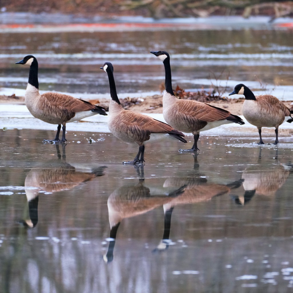 I didn’t see much more than mallards along the river until I reached the falls, where the slow and wide water just above them was full of Canada geese. Here’s a quartet standing on the ice just below the southern island.