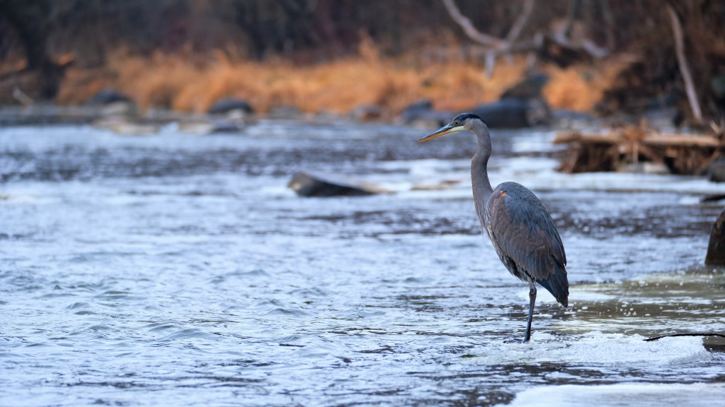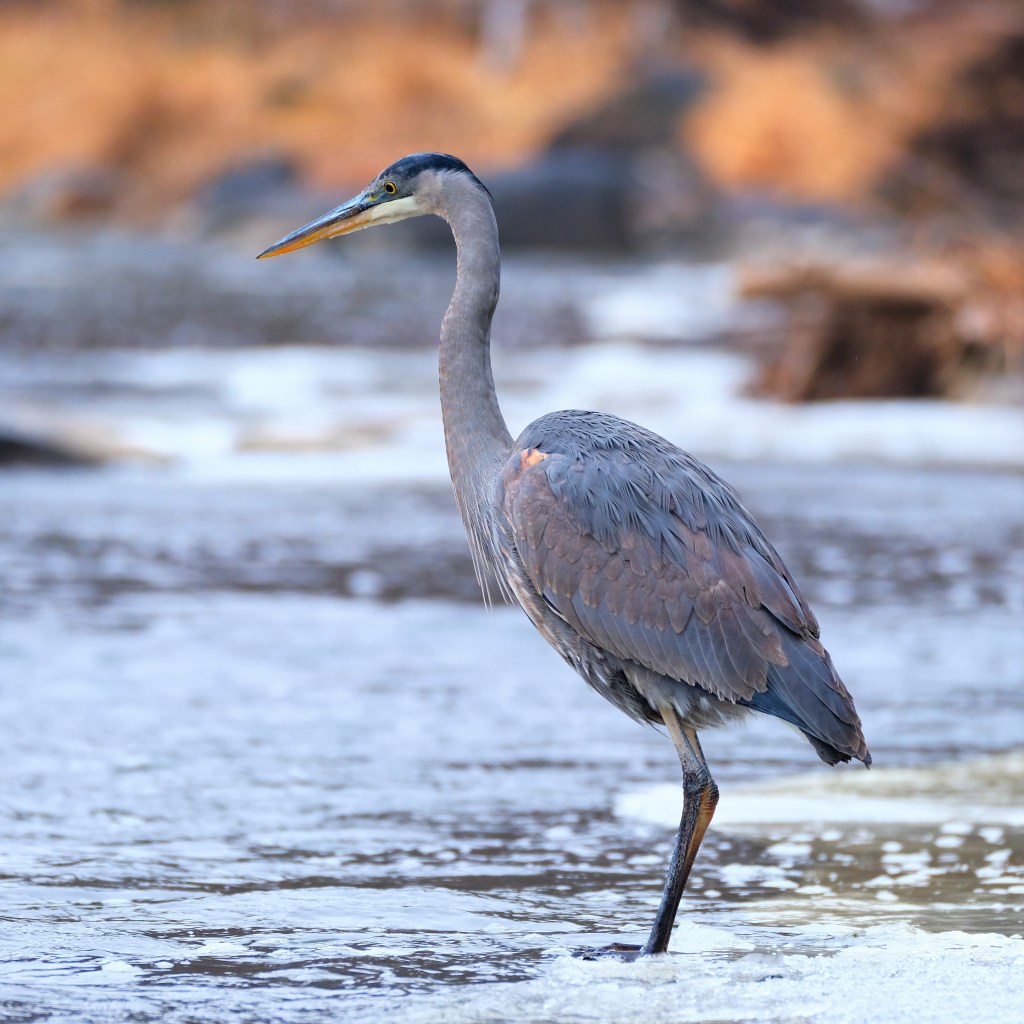 I didn’t see anything else remarkable at the north-end, and on my way south, I opted to hug the river again just because, and here’s my reward. Beside the mild rapids after the river turns to flow south again, our favorite blue heron was back to fishing.