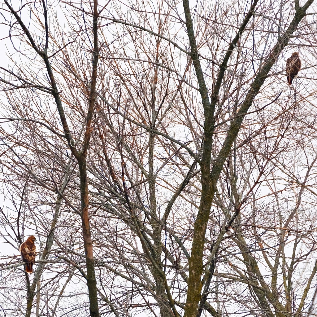 Our two “love birds”, the pair of red-tailed hawks, appear to be together enough to perch in the same tree, which is still an unusual sight for me.