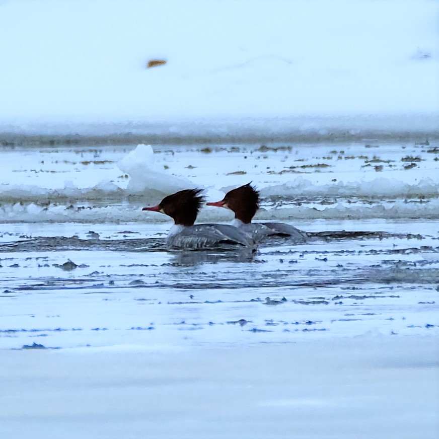 Above the falls, I did not see our kestrel again, but at least three of the common mergansers from last year were back and fishing among the ice floes, and here are two of them catching their breath for a moment.