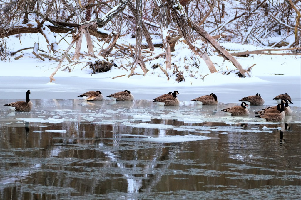 The water above the falls was similarly jammed up, but with Canada geese instead, which are far more photogenic, and here are a few napping on the ice.
