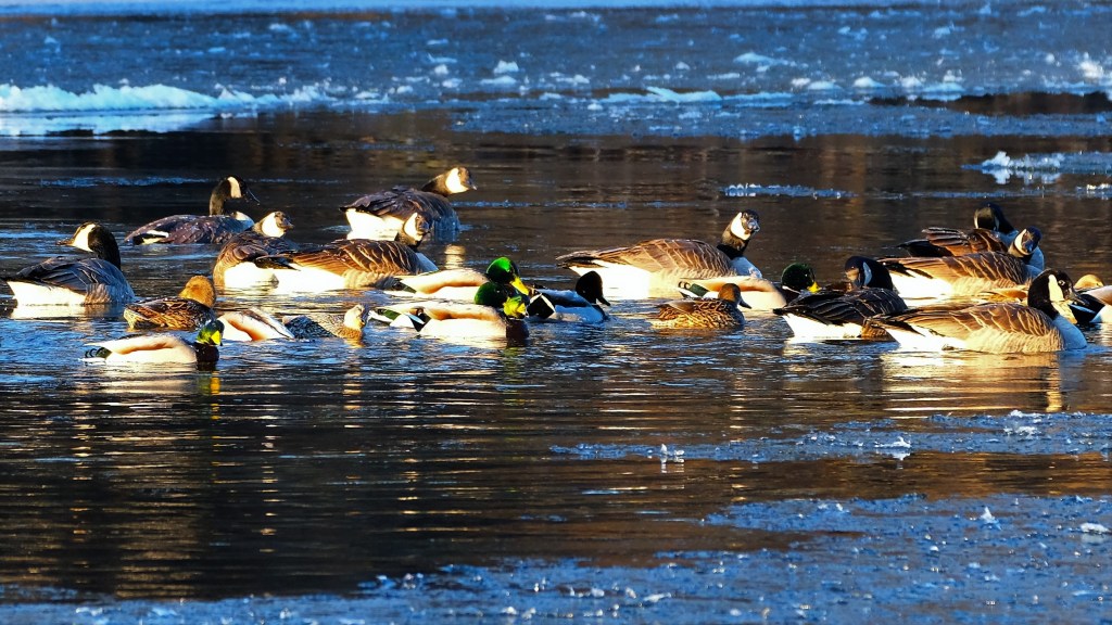 Here’s a fun shot of a bunch of mallards and geese above the falls keeping their eyes on the sky from all the way back on Wednesday, December 22, soon after the eagles started showing up.
