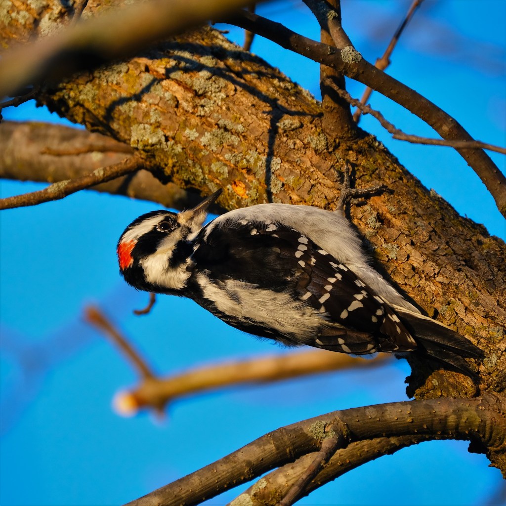 Finally, here are a couple shots of another black-capped chickadee at the south end from Friday, January 7, and this one is nibbling on a snack it has hauled up to that branch and is now grasping between its toes