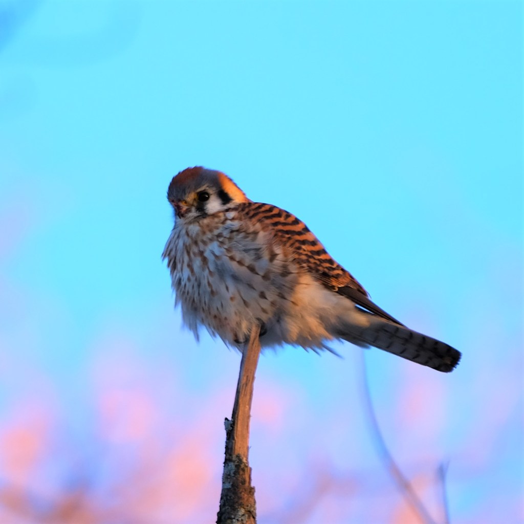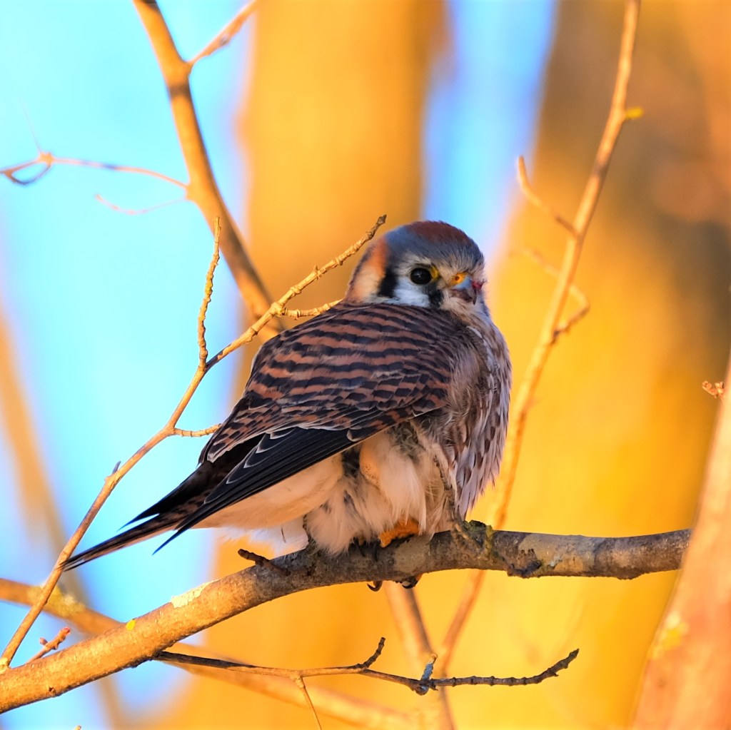 Yes, indeedy, our American kestrel was back and farther south into the park than last time. She and I have learned to get along better this time, and when I was willing to crawl on my belly in the snow, she was willing to let me take this much nicer portrait.