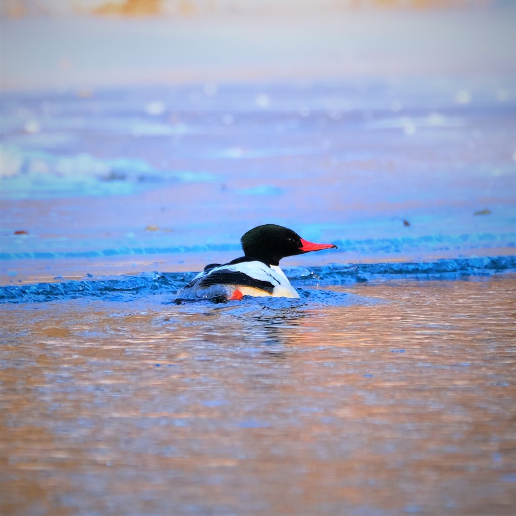 A bit farther south, there was a common merganser drake fishing all by his lonesome. I had seen two pair at the south end when I started, but there wasn’t much light yet, and I thought I’d have a better opportunity later. I thought wrong this time, however.