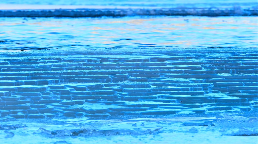 Instead, near the south end, just about where the rapids peter out, I spotted this amazing phenomenon. The ice has slowly built up in layers to create a dike at least a foot tall to hold back the running water.