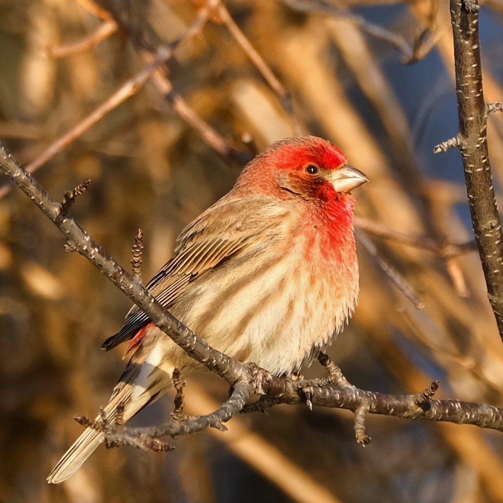 At the north end, where the sun shines down on the riverbank, and I can walk out on the ice to get a good view, there were a slew of little birds all foraging in the same vicinity. Here’s a house finch.