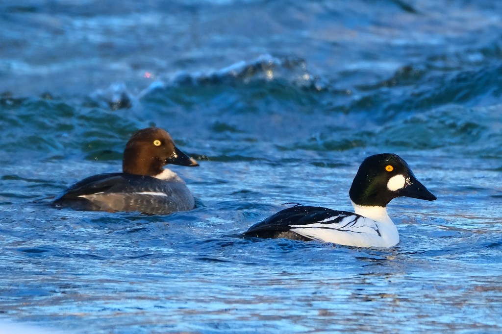 The first sight to great me was a couple pairs of goldeneyes and a common merganser hen all diving together. Here is one of the goldeneye couples, …