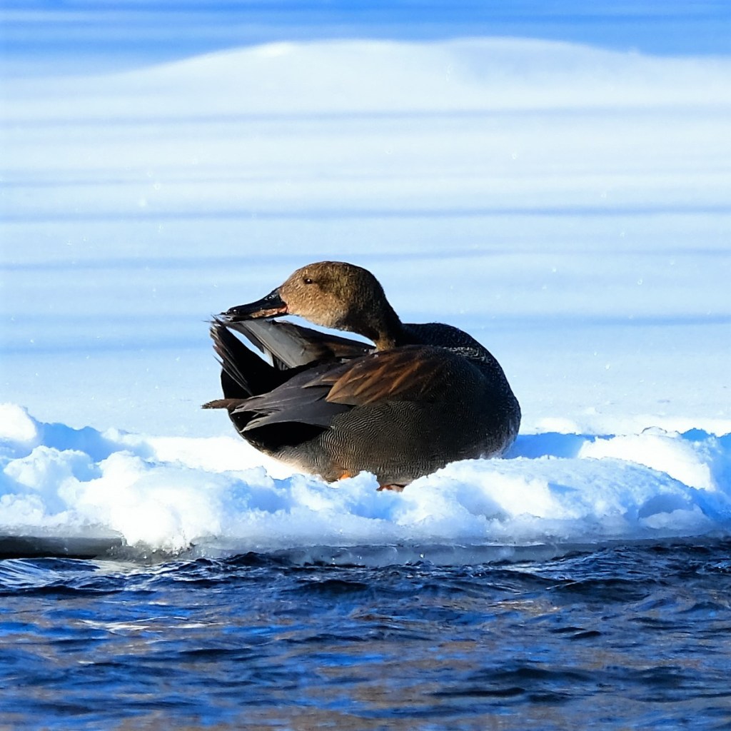 At the north edge of the open water, I could see about a dozen mallards, I could hear and caught a glimpse of a kingfisher, but not enough to know if it was our regular female or the newly-arrived male, and I found our gadwall drake taking a break from dabbling on the fresh thin blanket of snow.