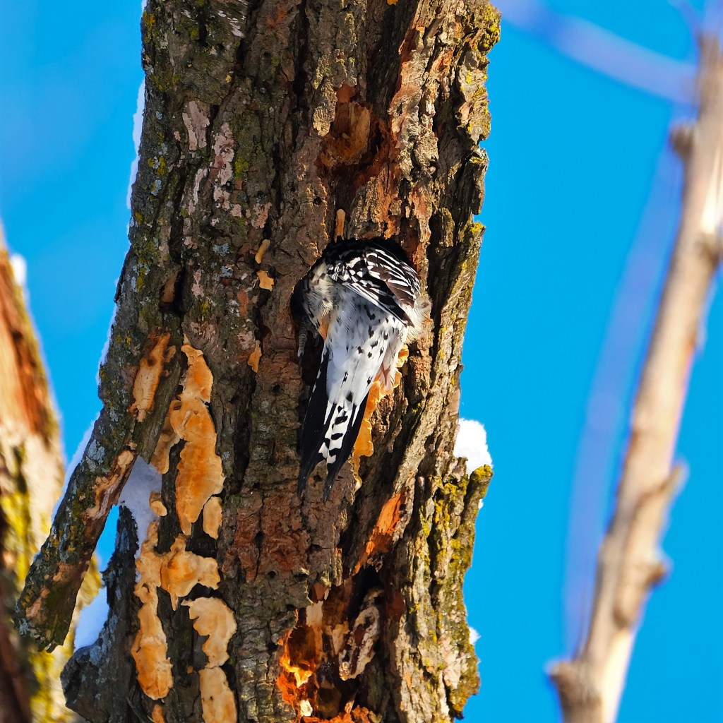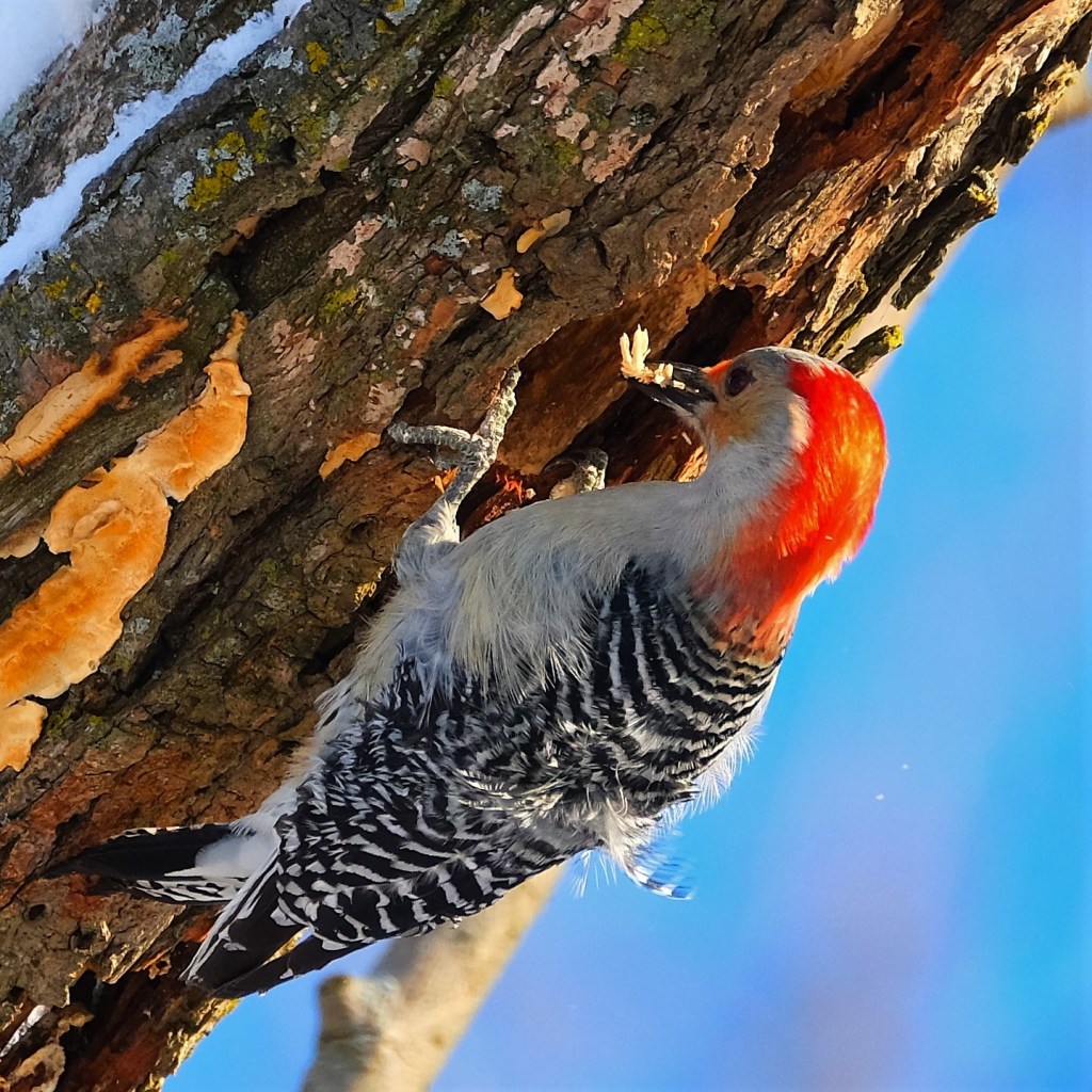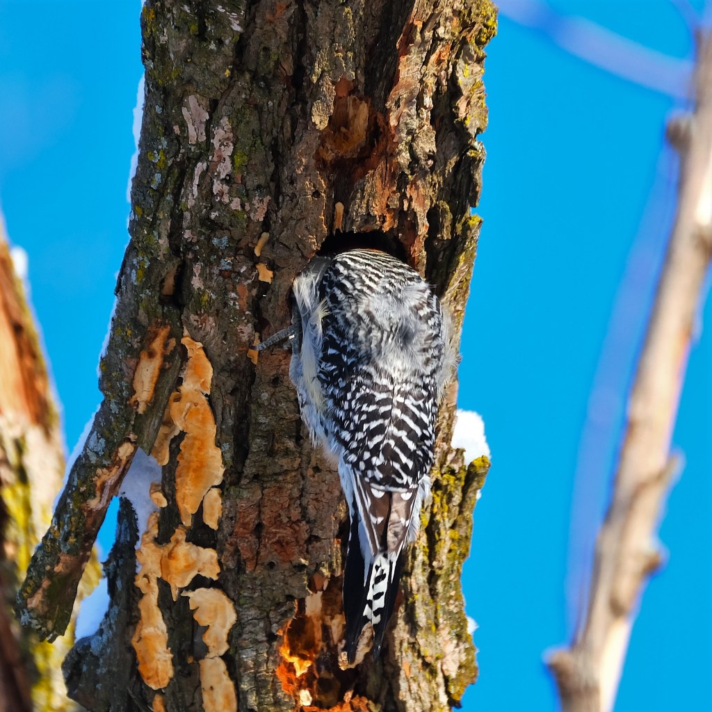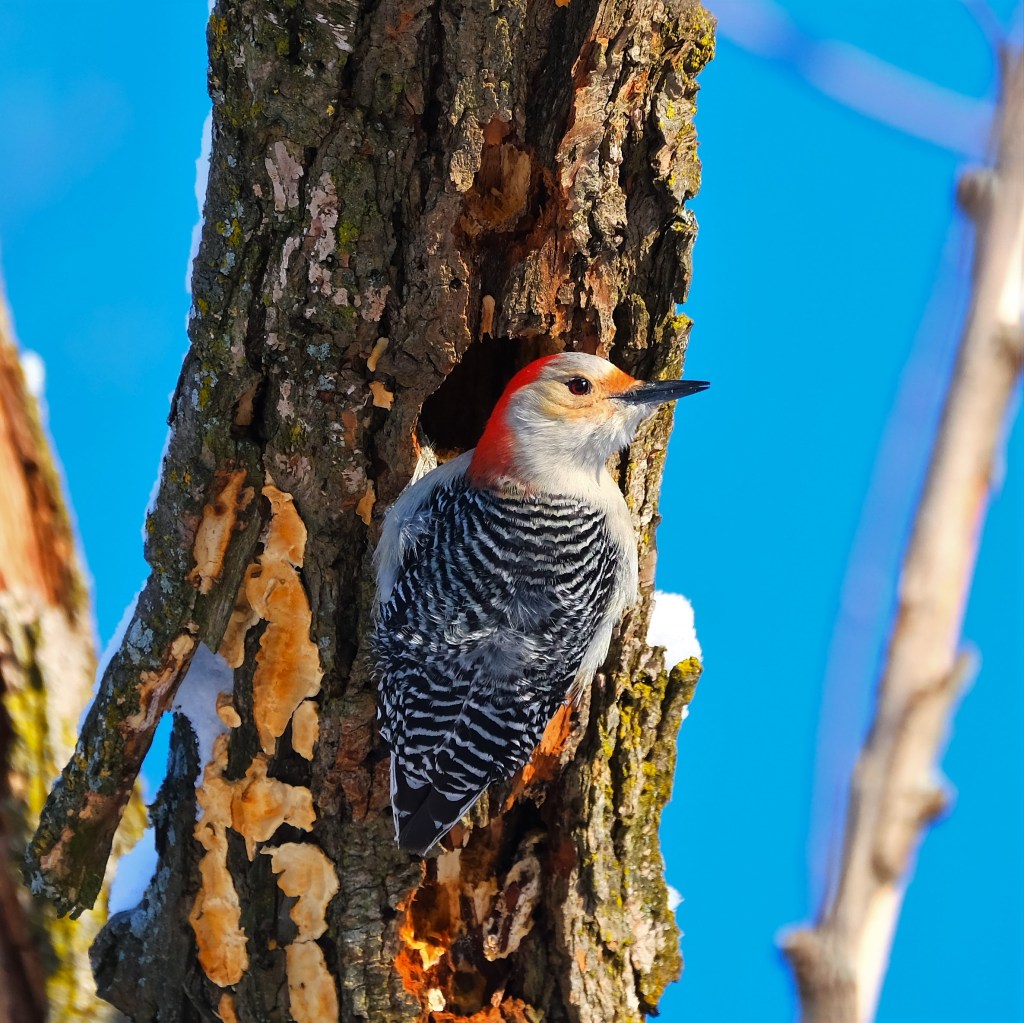 A bit further north, over the grassy field, I found this female red-bellied woodpecker hard at work on excavating a nesting cavity.
